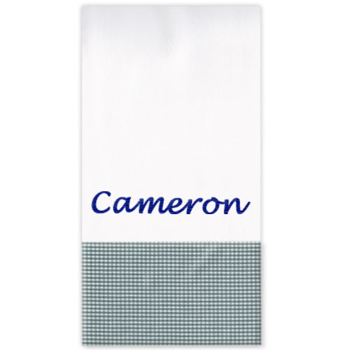 Personalized burp cloths are a fantastic way to display baby's name. They are by far one of the hardest-working items in the diaper bag and around the house. The Smoke Grey burp works great for a boy or a girl. Our exclusive burp cloths are created using a 100% cotton diaper service quality diaper which measures 20x14. We use the softest all cotton burp cloths available. All cotton burps will naturally shrink and quilt when washed. This is normal and adds to the absorbency and texture of the item. We suggest that you wash the burp cloths on gentle cycle in cold water and dry on low heat.