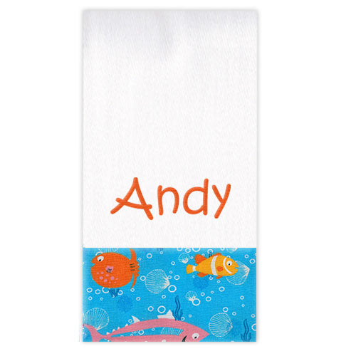Our Tropical Fish burp cloth is bright and fun! Personalize with orange thread for a pop of color. Green and Fuchsia colored fish not pictured on sample.